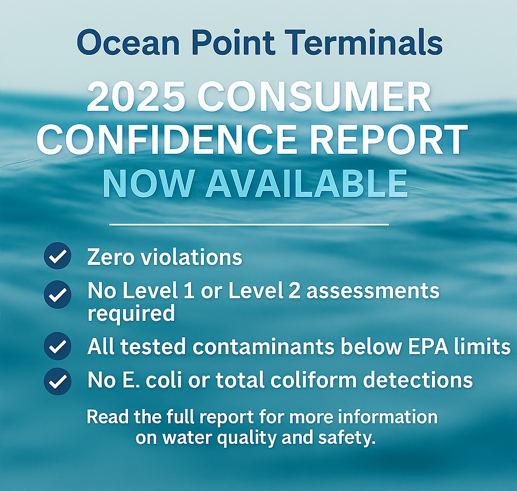 This report provides assurance that the drinking water at Ocean Point Terminals meets or exceeds all safety requirements.